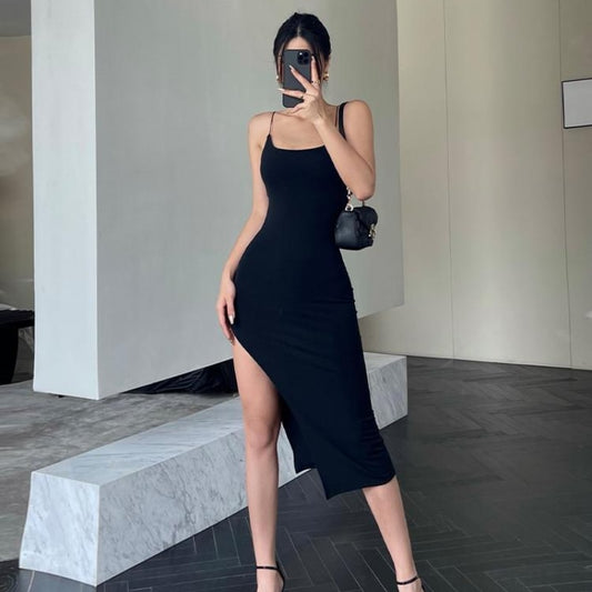 Thin Strap Front-Slit Midi Dress